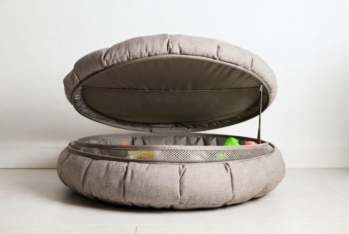 Ofrece una solución de almacenamiento rápida para juguetes, mantas o ropa, al mismo tiempo que funciona como asiento. Esto elimina la necesidad de añadir más muebles, optimizando el espacio disponible.